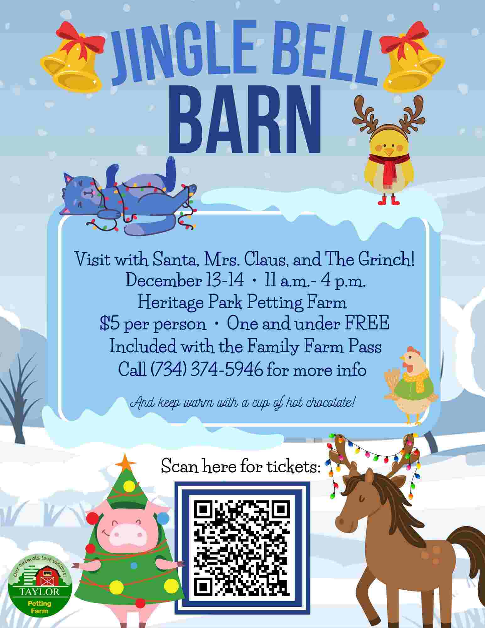 Join us on our holiday stroll with lights, characters, & a walk through the barn! Make sure to bring your camera for plenty of photo ops. Time slots available; pre-purchased tickets guarantee admission. First time slot is 6 p.m. and the last time slot is 8:30 pm; must be at the gate by 8:45 p.m. to enter! Entrance and exit at the Heritage Park Petting Farm.