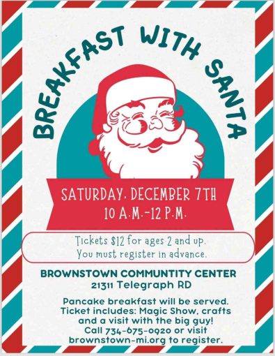 Breakfast with Santa – Brownstown Share Calendar Add to Calendar Add to Timely Calendar Add to Google Add to Outlook Add to Apple Calendar Add to other calendar Export to XML When: 12/07/2024 @ 10:00 am – 12:00 pm 2024-12-07T10:00:00-05:00 2024-12-07T12:00:00-05:00 Where: Community Center 21311 Telegraph Rd Brownstown Charter Twp, MI 48183 USA Cost: $12 residents-$15 non residents MUST REGISTER Contact: Brownstown Parks & Recreation Event website Brownstown Christmas **Click on the picture for more details** Share FacebookTwitterEmailPrint