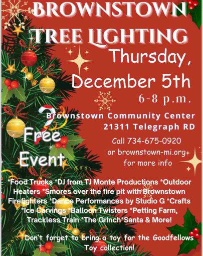 Brownstown Tree Lighting Share Calendar Add to Calendar Add to Timely Calendar Add to Google Add to Outlook Add to Apple Calendar Add to other calendar Export to XML When: 12/05/2024 @ 6:00 pm – 8:00 pm 2024-12-05T18:00:00-05:00 2024-12-05T20:00:00-05:00 Where: Community Center and Grounds 21311 Telegraph Rd Brownstown Charter Twp, MI 48183 USA Cost: Free Contact: Brownstown Parks & Recreation Event website Brownstown Christmas **Click on the picture for more details** Share FacebookTwitterEmailPrint