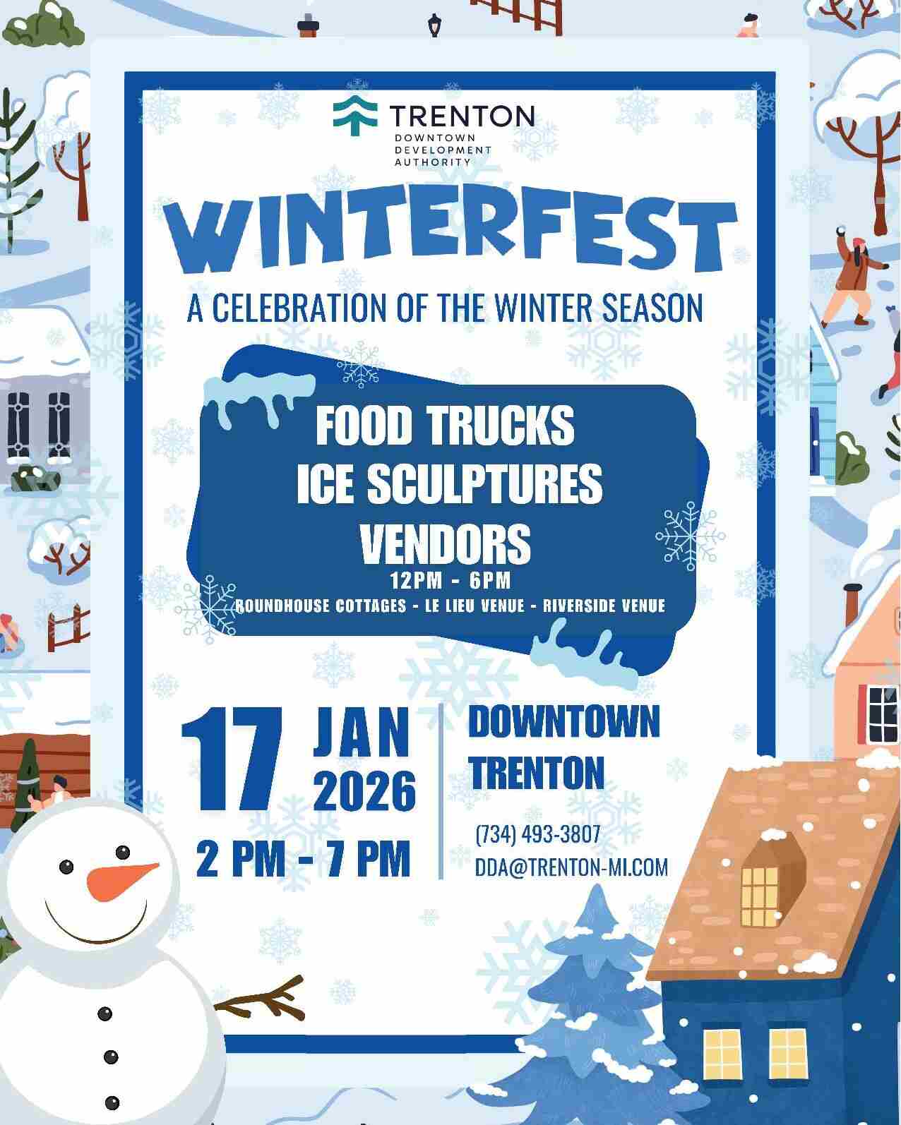 Trenton – Downtown Winterfest Share Calendar Add to Calendar Add to Timely Calendar Add to Google Add to Outlook Add to Apple Calendar Add to other calendar Export to XML When: 01/17/2026 @ 2:00 pm – 01/18/2026 @ 7:00 pm2026-01-17T14:00:00-05:002026-01-18T19:00:00-05:00Where: 2644 W Jefferson Ave Trenton, MI 48183 USAContact: Event website Food Events Outdoor Fun Trenton**Click on the picture for more details** Share FacebookTwitterEmailPrint