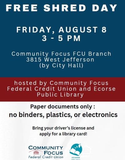 Ecorse CFFCU – FREE SHRED DAY Share Calendar Add to Calendar Add to Timely Calendar Add to Google Add to Outlook Add to Apple Calendar Add to other calendar Export to XML When: 08/08/2025 @ 3:00 pm – 5:00 pm2025-08-08T15:00:00-04:002025-08-08T17:00:00-04:00Where: Community Focus Federal Credit Union - Ecorse Branch 3815 W. Jefferson Ave. Ecorse MI 48229Contact: Event website Ecorse Shred Day**Click on the picture for more details** Share FacebookTwitterEmailPrint