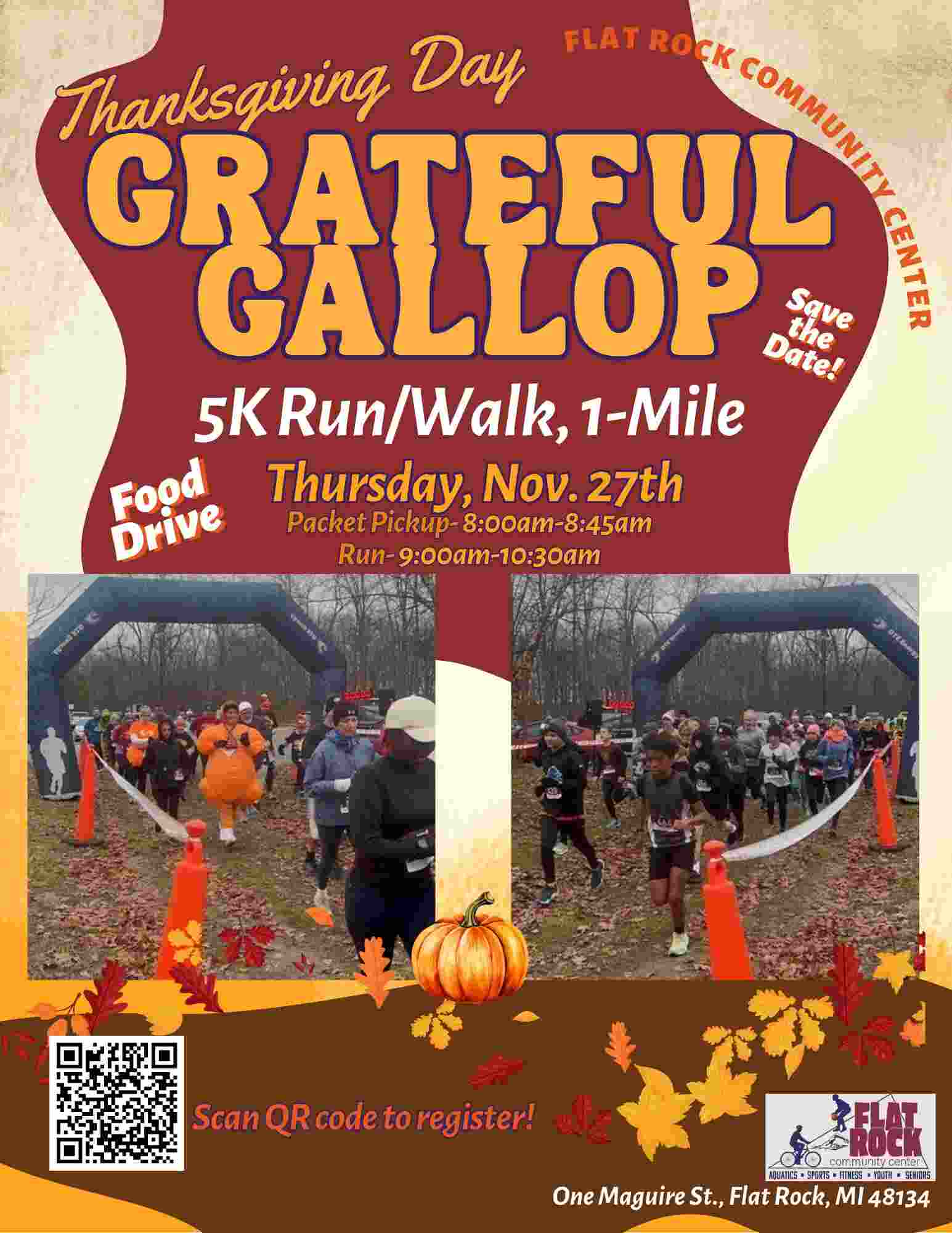 Flat Rock – Grateful Gallop (5K Run/Walk, 1-Mile) Share Calendar Add to Calendar Add to Timely Calendar Add to Google Add to Outlook Add to Apple Calendar Add to other calendar Export to XML When: 11/27/2025 @ 9:00 am – 10:30 am 2025-11-27T09:00:00-05:00 2025-11-27T10:30:00-05:00 Where: Flat Rock Community Center 1 Maguire St Flat Rock MI 48134 Contact: Event website Flat Rock Runs and Walks **Click on the picture for more details** Share FacebookTwitterEmailPrint