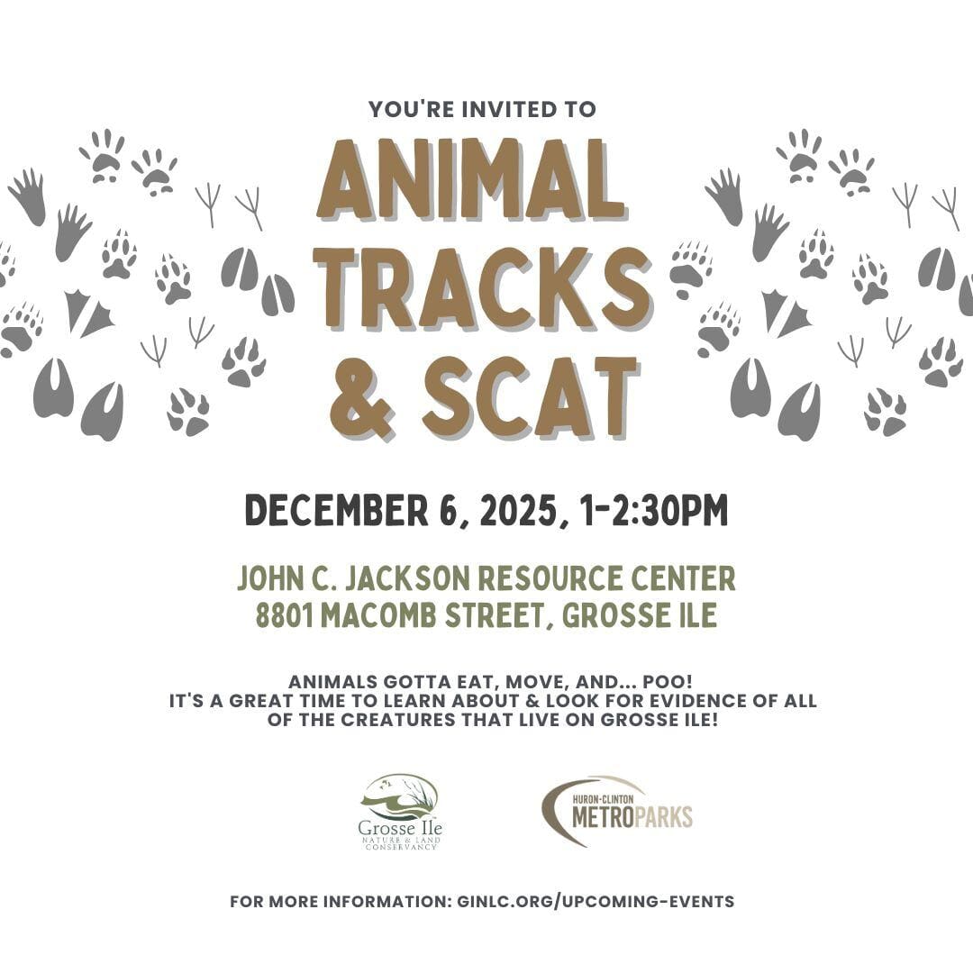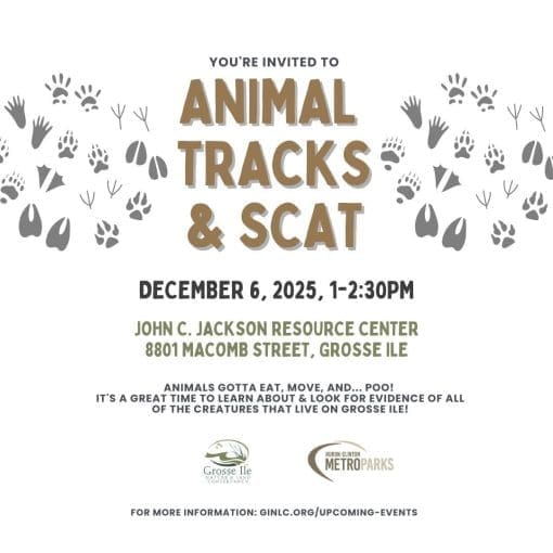 Grosse Ile Animal Tracks & Scat Share Calendar Add to Calendar Add to Timely Calendar Add to Google Add to Outlook Add to Apple Calendar Add to other calendar Export to XML When: 12/06/2025 @ 1:00 pm – 2:30 pm2025-12-06T13:00:00-05:002025-12-06T14:30:00-05:00Where: John C Jackson Resource Center 8801 Macomb St. Grosse Ile MICost: FreeContact: Grosse Ile Nature & Land Conservancy Event website Grosse Ile Nature**Click on the picture for more details** Share FacebookTwitterEmailPrint