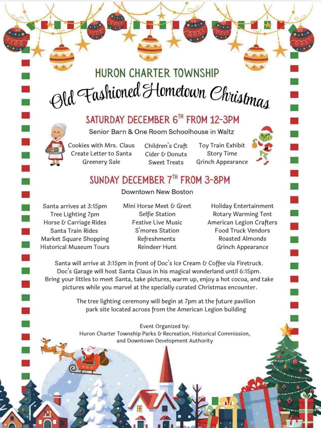 Huron/New Boston – Old Fashioned Hometown Christmas Events Share Calendar Add to Calendar Add to Timely Calendar Add to Google Add to Outlook Add to Apple Calendar Add to other calendar Export to XML When: 12/06/2025 all-day Repeats 2025-12-06T00:00:00-05:00 2025-12-07T00:00:00-05:00 Where: Downtown, New Boston Cost: Free Contact: Event website Christmas Huron Twp Kids Music Outdoor Fun **Click on the picture for more details** Share FacebookTwitterEmailPrint