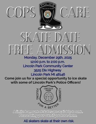 Lincoln Park – Cops Care Skate Date Share Calendar Add to Calendar Add to Timely Calendar Add to Google Add to Outlook Add to Apple Calendar Add to other calendar Export to XML When: 12/29/2025 @ 12:00 pm – 2:00 pm2025-12-29T12:00:00-05:002025-12-29T14:00:00-05:00Where: Lincoln Park Community Center 3525 Dix Highway Lincoln Park MI 48146Cost: FreeContact: Lincoln Park Police Department Event website Kids Lincoln Park**Click on the picture for more details** Share FacebookTwitterEmailPrint