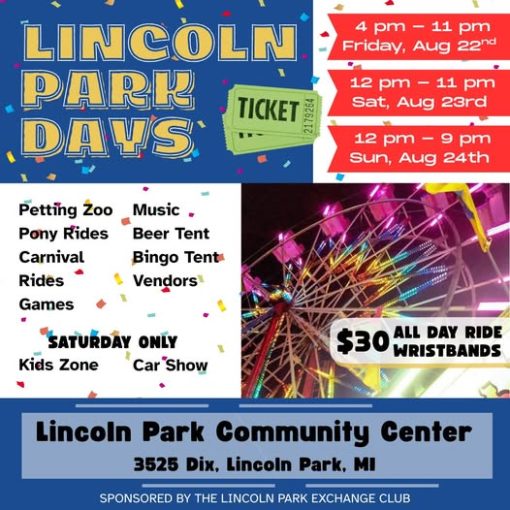 Lincoln Park Days Share Calendar Add to Calendar Add to Timely Calendar Add to Google Add to Outlook Add to Apple Calendar Add to other calendar Export to XML When: 08/22/2025 all-day Repeats 2025-08-22T00:00:00-04:00 2025-08-23T00:00:00-04:00 Where: Lincoln Park Community Center 3525 Dix Hwy Lincoln Park, MI 48146 USA Contact: Event website Festival Kids Lincoln Park Music **Click on the picture for more details** Share FacebookTwitterEmailPrint