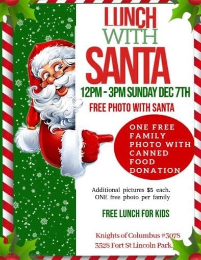 Lincoln Park – Lunch with Santa Share Calendar Add to Calendar Add to Timely Calendar Add to Google Add to Outlook Add to Apple Calendar Add to other calendar Export to XML When: 12/07/2025 @ 12:00 pm – 3:00 pm2025-12-07T12:00:00-05:002025-12-07T15:00:00-05:00Where: KOC #3078 3528 Fort Street Lincoln Park MICost: canned good donationContact: Event website Christmas Kids Lincoln Park**Click on the picture for more details** Share FacebookTwitterEmailPrint