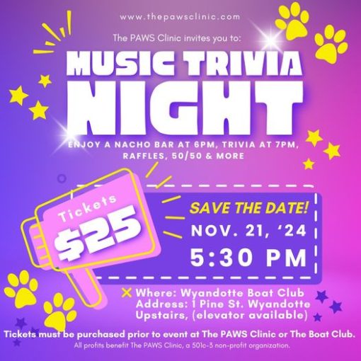 -Tickets: $25 (must be purchased in advance by clicking here https://www.paypal.com/donate/?hosted_button_id=HHUXE2DB78QXS&fbclid , Wyandotte Boat Club or The PAWS Clinic