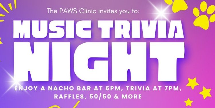 Join us for a fun-filled evening in support of The PAWS Clinic! Enjoy a nacho bar at 6pm followed by Trivia at 7pm, along with exciting raffles, 50/50, and more!