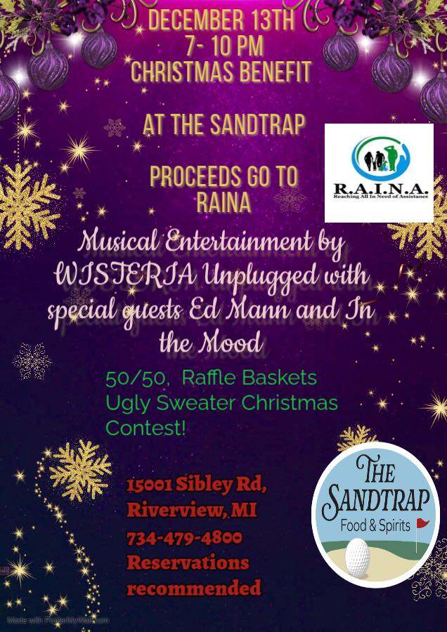 Riverview – Wisteria & Friends at RAINA Annual Christmas Benefit Share Calendar Add to Calendar Add to Timely Calendar Add to Google Add to Outlook Add to Apple Calendar Add to other calendar Export to XML When: 12/13/2025 @ 7:00 pm – 10:00 pm2025-12-13T19:00:00-05:002025-12-13T22:00:00-05:00Where: Sand Trap 15001 Sibley Road Riverview MIContact: Event website Christmas Fundraiser Music Riverview**Click on the picture for more details** Share FacebookTwitterEmailPrint