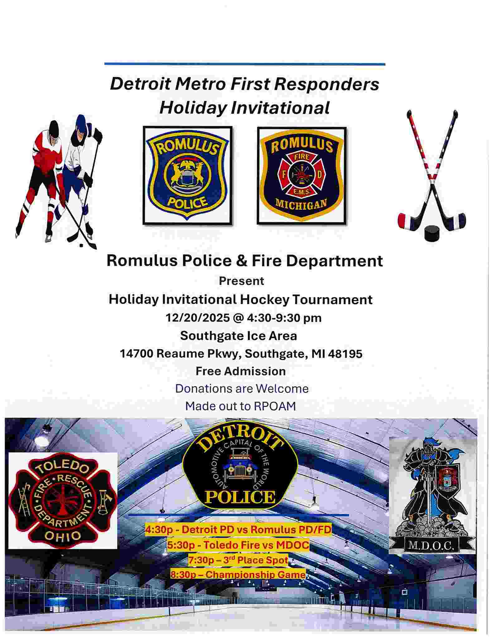 Romulus – First Responders Holiday Invitational Hockey Tournament Share Calendar Add to Calendar Add to Timely Calendar Add to Google Add to Outlook Add to Apple Calendar Add to other calendar Export to XML When: 12/20/2025 @ 4:30 pm – 9:30 pm2025-12-20T16:30:00-05:002025-12-20T21:30:00-05:00Where: Southgate Ice Area 14700 Reaume Pkwy Southgate MI 48195Cost: FreeContact: Event website Local Event Romulus**Click on the picture for more details** Share FacebookTwitterEmailPrint