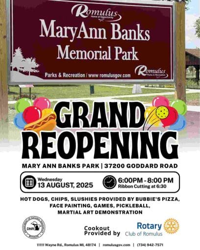 Romulus – Mary Ann Banks Memorial Park Grand Reopening Share Calendar Add to Calendar Add to Timely Calendar Add to Google Add to Outlook Add to Apple Calendar Add to other calendar Export to XML When: 08/13/2025 @ 6:00 pm – 8:00 pm2025-08-13T18:00:00-04:002025-08-13T20:00:00-04:00Where: Mary Ann Banks Memorial Park 37200 Goddard Rd Romulus MI 48174Cost: FreeContact: Event website Kids Local Event Romulus**Click on the picture for more details** Share FacebookTwitterEmailPrint