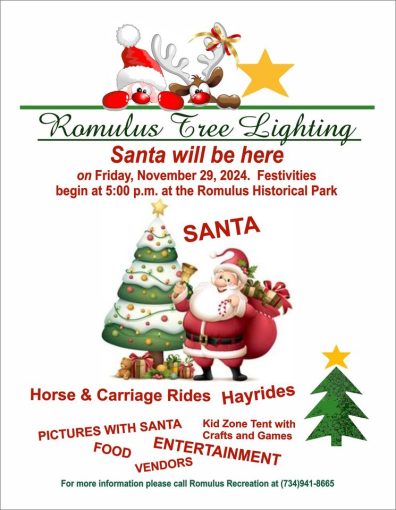 Romulus Tree Lighting Share Calendar Add to Calendar Add to Timely Calendar Add to Google Add to Outlook Add to Apple Calendar Add to other calendar Export to XML When: 11/29/2024 @ 5:00 pm 2024-11-29T17:00:00-05:00 2024-11-29T17:15:00-05:00 Where: Romulus Historical Park 11112 Hunt St Romulus, MI 48174 USA Cost: Free Contact: Event website Christmas Romulus **Click on the picture for more details** Share FacebookTwitterEmailPrint