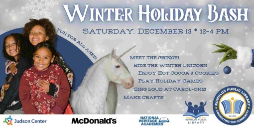 Romulus Winter Holiday Bash! Share Calendar Add to Calendar Add to Timely Calendar Add to Google Add to Outlook Add to Apple Calendar Add to other calendar Export to XML When: 12/13/2025 @ 12:00 pm – 4:00 pm 2025-12-13T12:00:00-05:00 2025-12-13T16:00:00-05:00 Where: Romulus Public Library 11121 Wayne Rd Romulus MI 48174 Cost: Free Contact: Event website Christmas Kids Romulus **Click on the picture for more details** Share FacebookTwitterEmailPrint