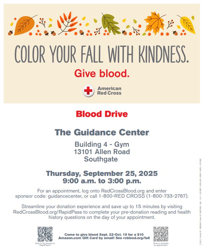 Please click on the link below to sign up, and us sponsor code “guidancecenter” https://www.redcrossblood.org/give.html/find-drive
