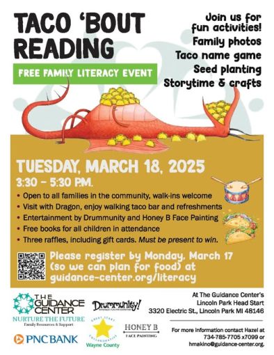 Taco ‘Bout Reading Share Calendar Register Add to Calendar Add to Timely Calendar Add to Google Add to Outlook Add to Apple Calendar Add to other calendar Export to XML When: 03/18/2025 @ 3:30 pm – 5:30 pm 2025-03-18T15:30:00-04:00 2025-03-18T17:30:00-04:00 Where: The Guidance Center - Lincoln Park Head Start 3320 Electronic St Lincoln Park MI 48146 Cost: Free Contact: The Guidance Center Event website Kids Lincoln Park **Click on the picture for more details** Share FacebookTwitterEmailPrint