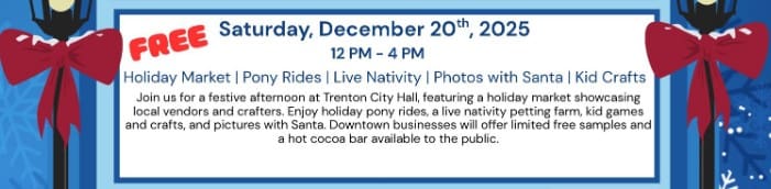 Trenton – Downtown Noel Night – Holiday Market | Pony Rides | Live Nativity | Pictures w/Santa | Kid Crafts Share Calendar Add to Calendar Add to Timely Calendar Add to Google Add to Outlook Add to Apple Calendar Add to other calendar Export to XML When: 12/20/2025 @ 12:00 pm – 4:00 pm2025-12-20T12:00:00-05:002025-12-20T16:00:00-05:00Where: Starts at Trenton City Hall Downtown TrentonCost: FreeContact: Event website Christmas Kids Outdoor Fun Trenton**Click on the picture for more details** Share FacebookTwitterEmailPrint