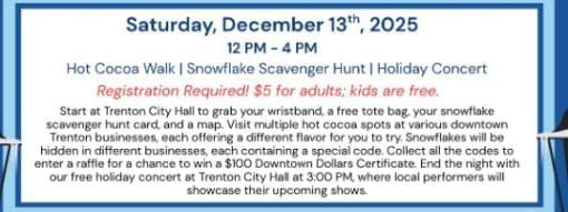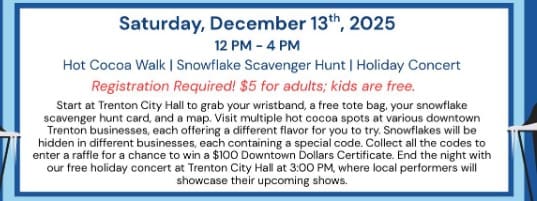 Trenton – Downtown Noel Night – Hot Cocoa Walk I Snowflake Scavenger I Holiday Concert Share Calendar Tickets Add to Calendar Add to Timely Calendar Add to Google Add to Outlook Add to Apple Calendar Add to other calendar Export to XML When: 12/13/2025 @ 12:00 pm – 4:00 pm2025-12-13T12:00:00-05:002025-12-13T16:00:00-05:00Where: Starts at Trenton City Hall Downtown TrentonCost: $5 adults - kids are freeContact: Event website Christmas Kids Music Outdoor Fun Trenton**Click on the picture for more details** Share FacebookTwitterEmailPrint
