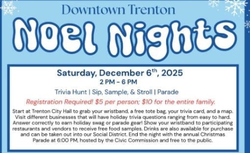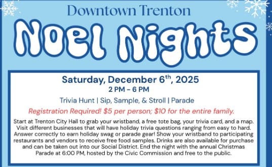 Trenton – Downtown Noel Night – Trivia Hunt I Sip, Sample & Stroll I Parade Share Calendar Tickets Add to Calendar Add to Timely Calendar Add to Google Add to Outlook Add to Apple Calendar Add to other calendar Export to XML When: 12/06/2025 @ 2:00 pm – 6:00 pm2025-12-06T14:00:00-05:002025-12-06T18:00:00-05:00Where: Starts at Trenton City Hall Downtown TrentonCost: $5 Ind - $10 entire familyContact: Event website Christmas Kids Outdoor Fun Parade Trenton**Click on the picture for more details** Share FacebookTwitterEmailPrint