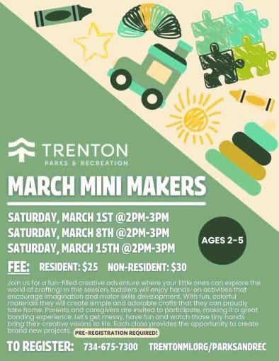 Trenton March Mini Makers (ages 2 – 5) Share Calendar Tickets Add to Calendar Add to Timely Calendar Add to Google Add to Outlook Add to Apple Calendar Add to other calendar Export to XML When: 03/15/2025 @ 2:00 pm – 3:00 pm Repeats 2025-03-15T14:00:00-04:002025-03-15T15:00:00-04:00Where: Westfield Center 2700 Westfield Rd Trenton, MI 48183 USACost: Fee covers all dates $25 Resident/$30 NonContact: Event website Kids Trenton**Click on the picture for more details** Share FacebookTwitterEmailPrint