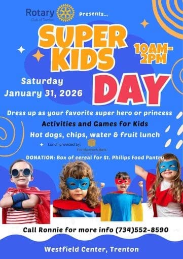 Trenton Rotary presents Super Kids Day! Share Calendar Add to Calendar Add to Timely Calendar Add to Google Add to Outlook Add to Apple Calendar Add to other calendar Export to XML When: 01/31/2026 @ 10:00 am – 2:00 pm2026-01-31T10:00:00-05:002026-01-31T14:00:00-05:00Where: Westfield Center 2700 Westfield Rd Trenton MI 48183Cost: Donation of a Box of CerealContact: Event website Kids Trenton**Click on the picture for more details** Share FacebookTwitterEmailPrint