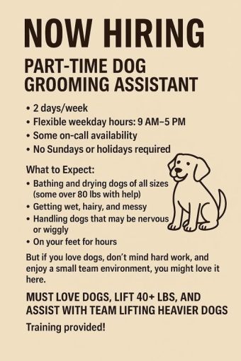 Apply via this form only, please! “Dog grooming assistant application” at: https://form.jotform.com/251304316421039