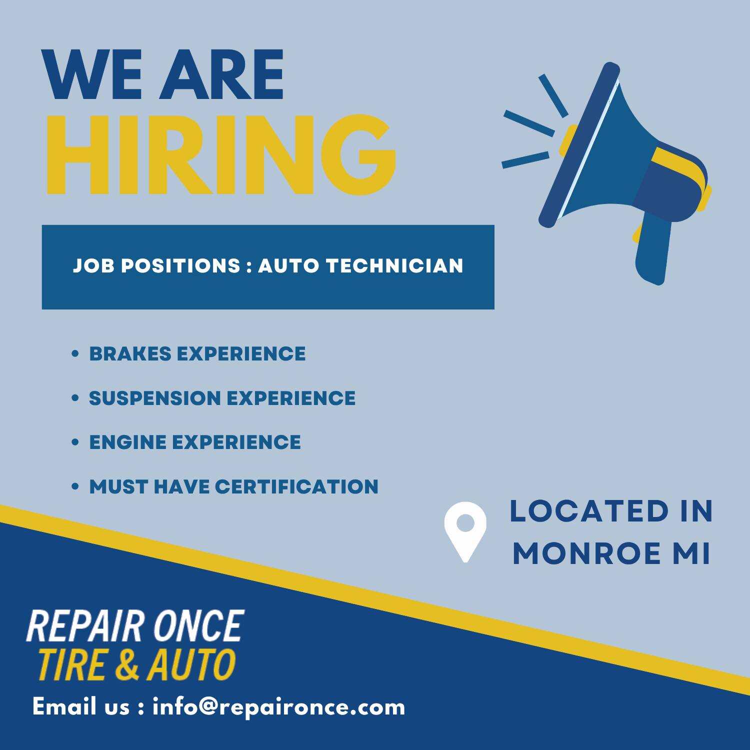 Auto Technician Share Full Time Monroe Posted 7 hours ago Website Repair Once Tire & Auto **Click on the picture for more details** Share FacebookTwitterEmailPrint