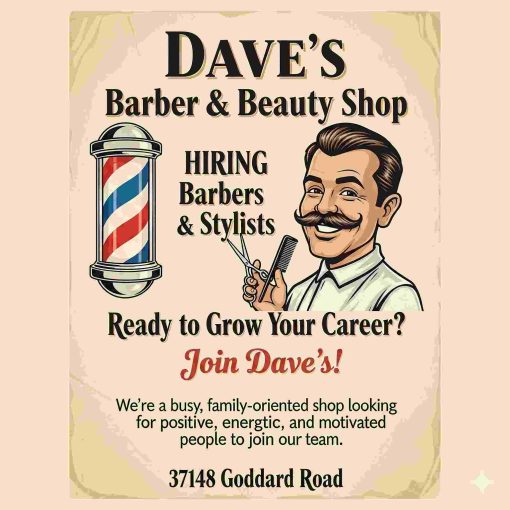 Barbers & Stylists Share Romulus Posted 2 weeks ago Website Dave's Barber & Beauty Shop Stop in for an interview – 37148 Goddard Road, Romulus Serious inquiries only. **Click on the picture for more details** Share FacebookTwitterEmailPrint
