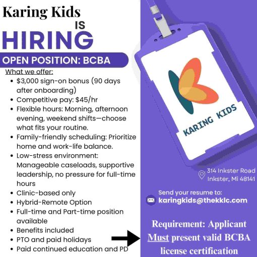 BCBA Share Full Time Inkster Posted 7 hours ago Karing Kids **Click on the picture for more details** Share FacebookTwitterEmailPrint