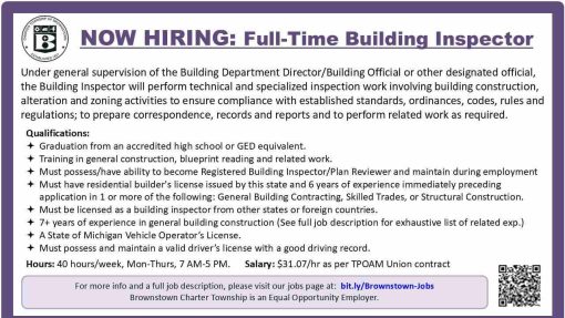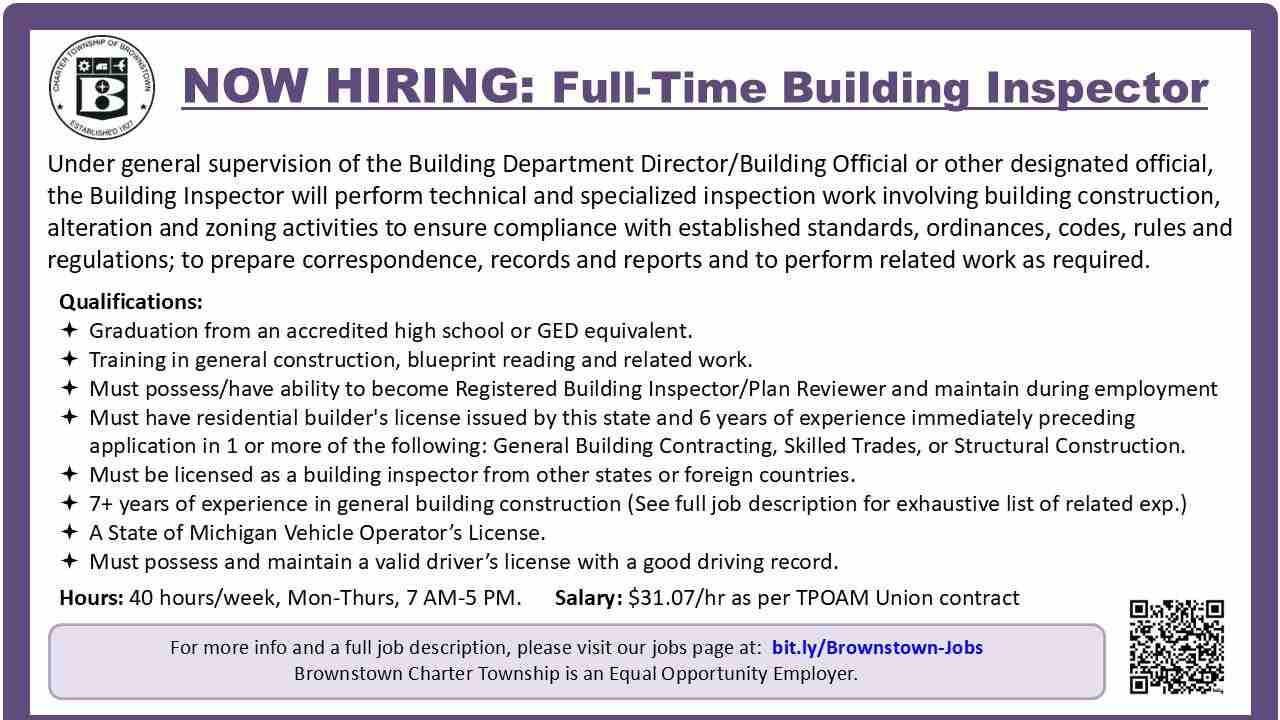 Building Inspector Share Full Time Brownstown Posted 2 weeks ago Website Charter Township of Brownstown Government **Click on the picture for more details** Share FacebookTwitterEmailPrint
