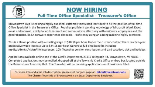 Office Specialist Share Full Time Brownstown Township Posted 2 weeks ago Website Charter Township of Brownstown Government **Click on the picture for more details** To apply for this job please visit www.facebook.com. Share FacebookTwitterEmailPrint