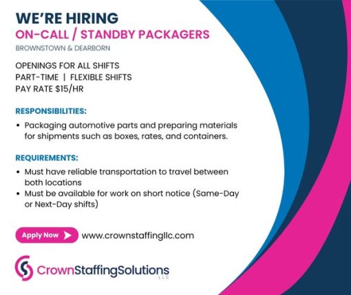 Packagers Share Part Time Brownstown & Dearborn Posted 1 hour ago Hiring 15–20 On-Call / Standby Packagers **Click on the picture for more details** Share FacebookTwitterEmailPrint
