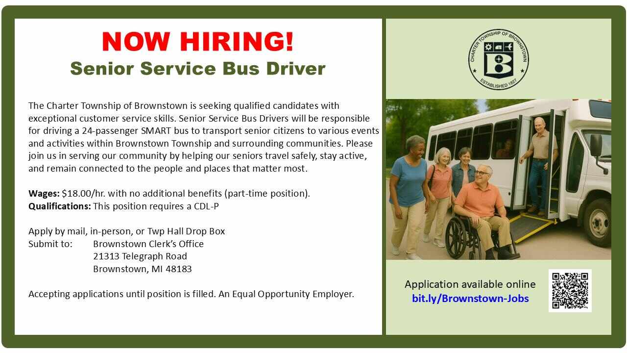 Senior Service Bus Driver Share Part Time Brownstown Posted 2 weeks ago Website Charter Township of Brownstown Government **Click on the picture for more details** Share FacebookTwitterEmailPrint