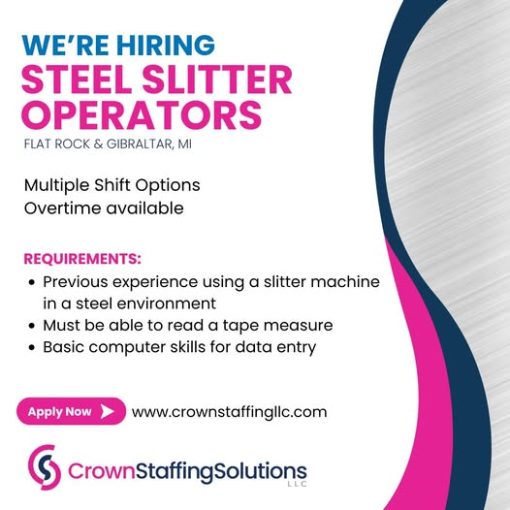 Steel Slitting Operators Share Full Time Gibraltar & Flat Rock Posted 4 days ago Crown Staffing Solutions is seeking experienced Slitter Operators in Gibraltar & Flat Rock, MI! **Click on the picture for more details** Share FacebookTwitterEmailPrint
