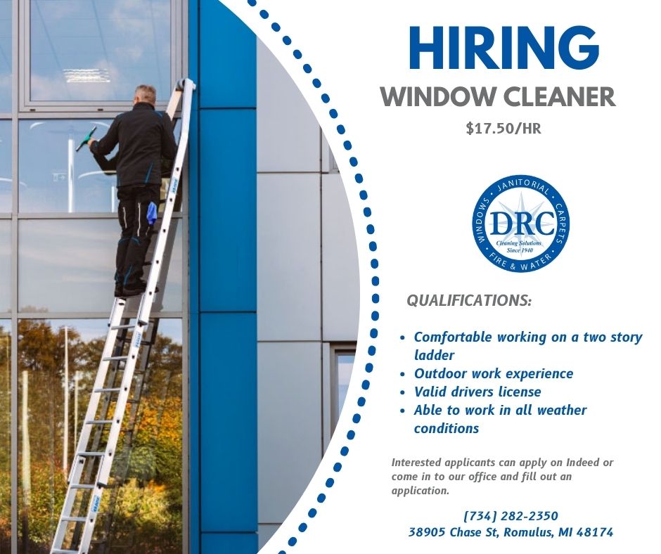 Window Cleaning Techs Share Full Time Romulus Posted 7 hours ago DRC Cleaning Solutions / Fire & Water Restoration $18.00/Hr plus benefits Call (734) 282-2350 for details. **Click on the picture for more details** Share FacebookTwitterEmailPrint